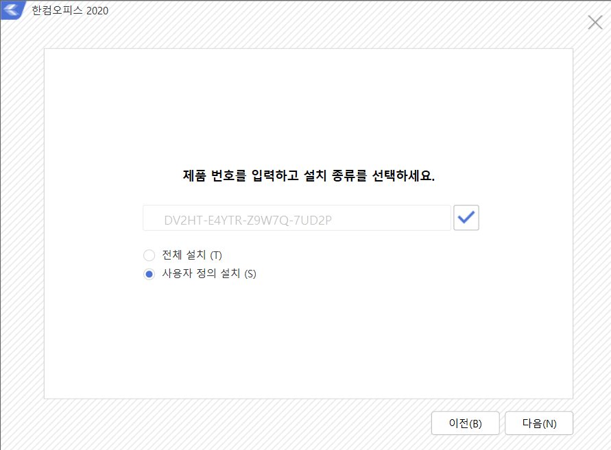 한컴오피스 2020 제품번호는 자동으로 입력되니 정품 걱정 마시고 설치하시면 됩니다~ 여기서 잠깐!! 한컴오피스에 있는 모든 프로그램을 사용하고 싶으신 분들만 전체 설치를 누르고 다음 버튼을 눌러주세요!!!