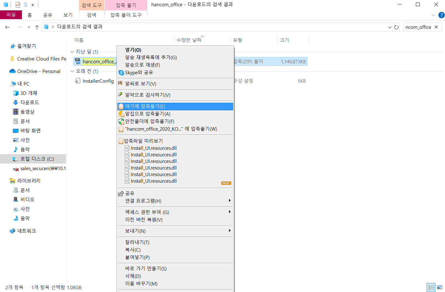 제가 제공해드린 한글 2020 설치 파일을 다운로드하셨다면 아래와 같이 hancom_office_2020_KOR 파일이 있으실 겁니다. 압축파일이니깐 먼저 압축을 풀어야겠죠? 압축을 풀어줍니다~(진짜 정말 정말 바이러스 없습니다~)