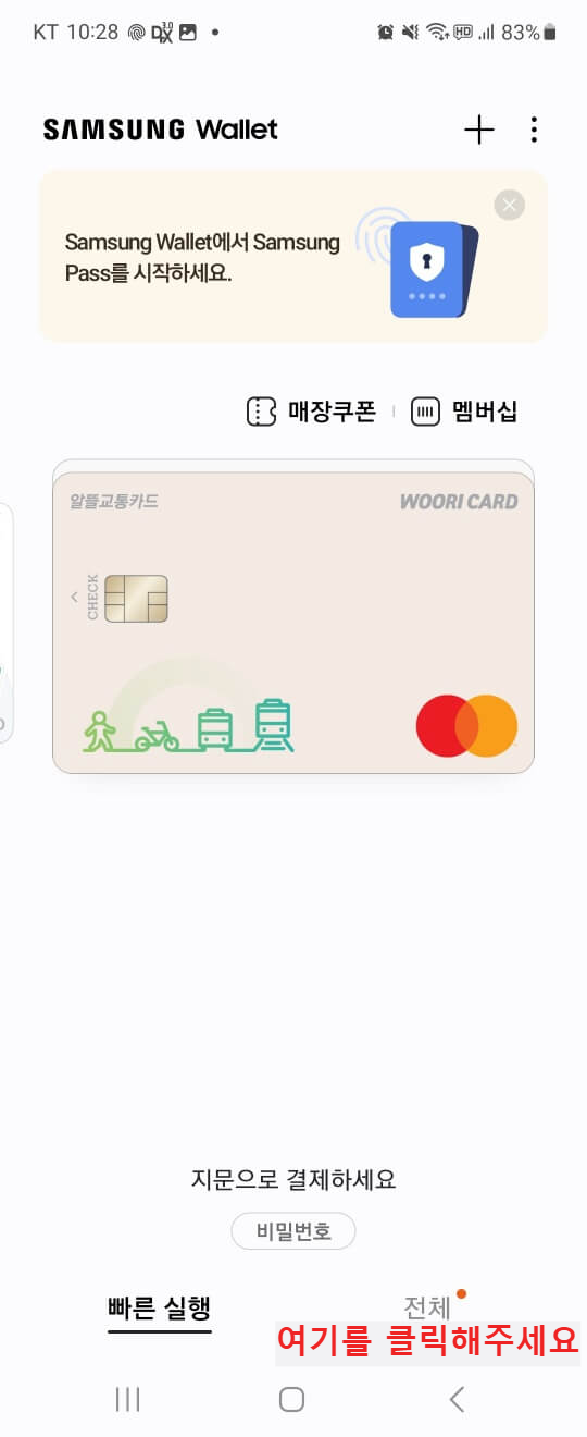 1. 위에 있는 삼성월렛을 키신 다음에 먼저 우리K패스 카드를 삼성페이에 등록합니다.