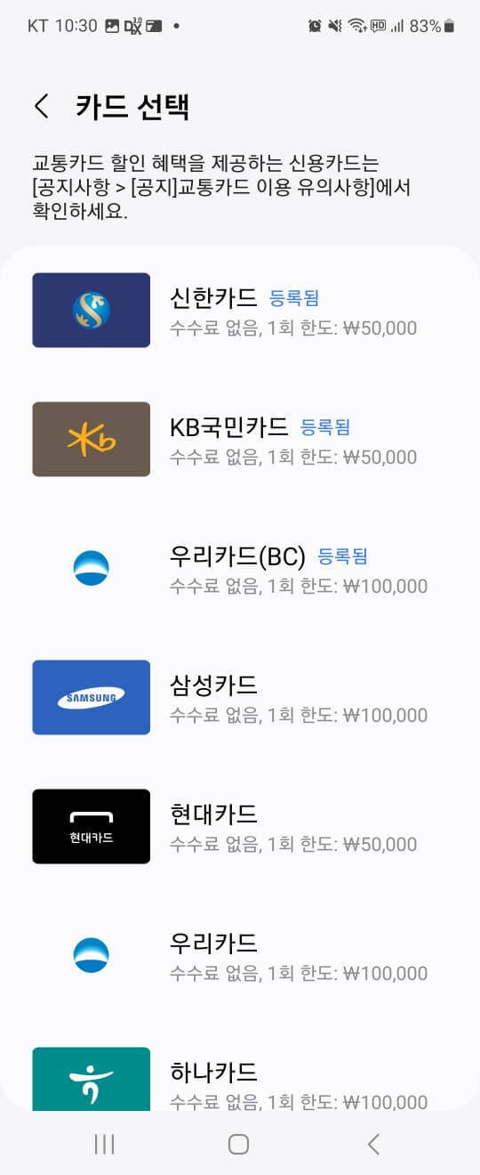 클릭 후에 카드 추가를 완료하면 모바일 티머니 앱에서 이용이 가능합니다!!