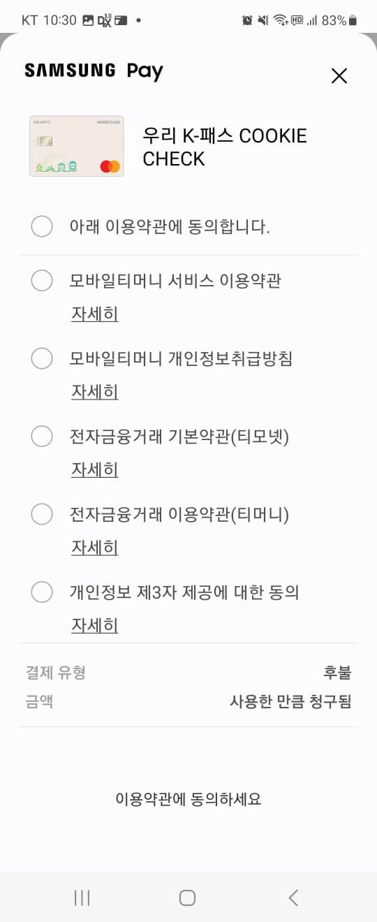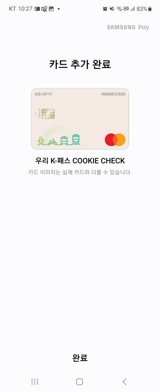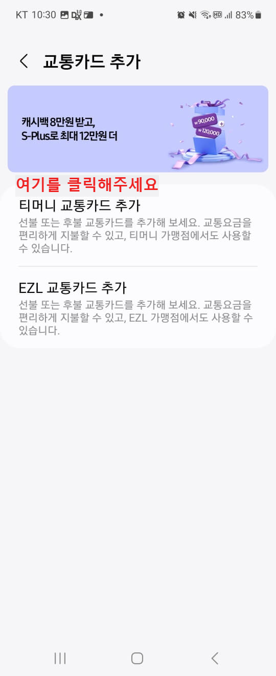 이렇게 위의 절차를 거친 후 삼성웰렛을 통해 티머니 교통카드 추가를 하셨다면 마지막으로 무엇이 남았죠?