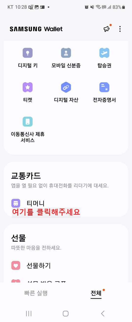 2. 삼성월렛에 K패스 카드를 추가하셨다면 하단에 있는 '전체'를 클릭한 뒤 스코를을 조금 내린다음 아래에 있는 교통카드 부분에 티머니를 클릭합니다.